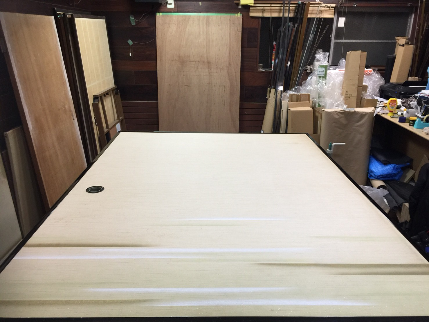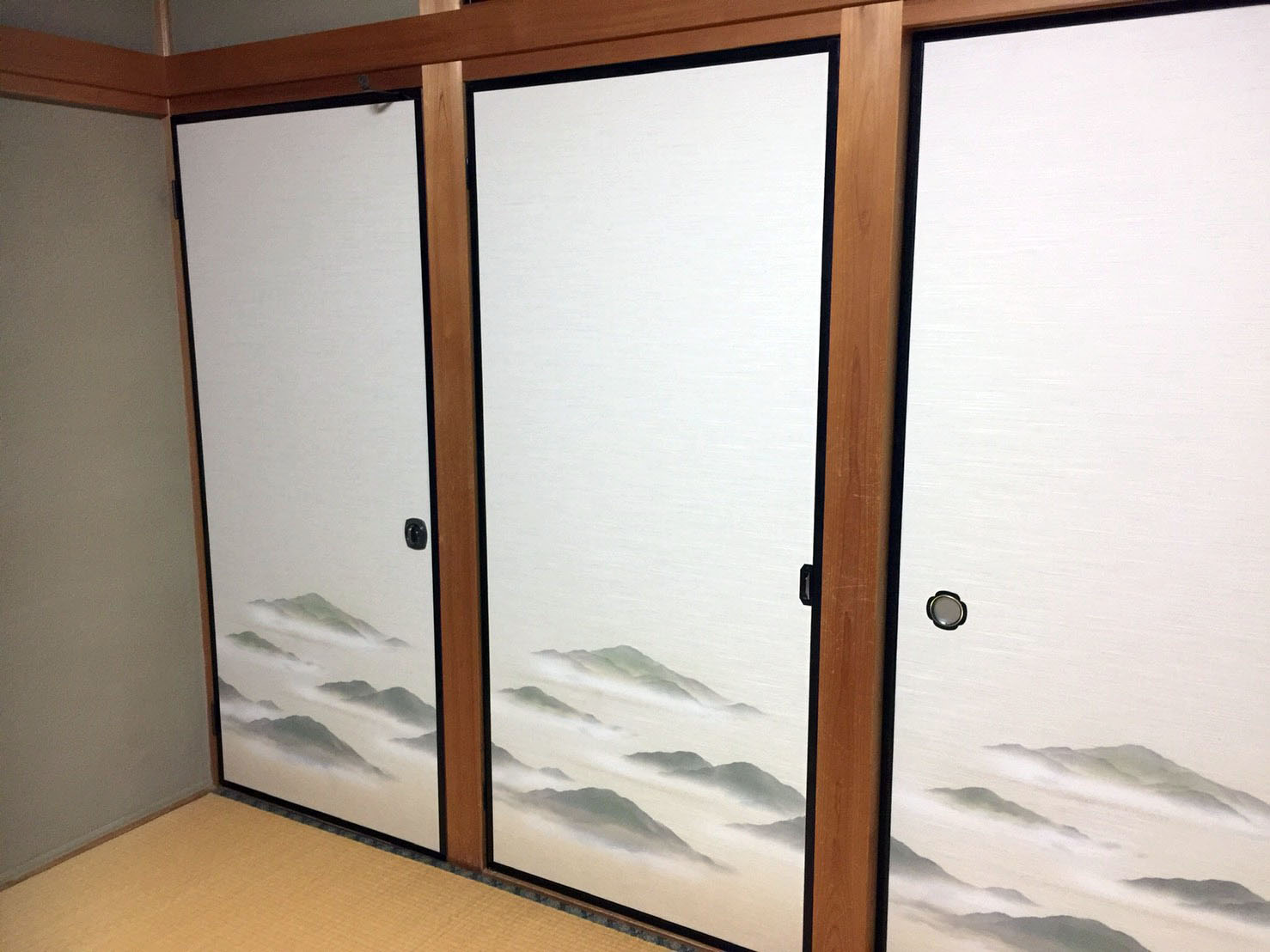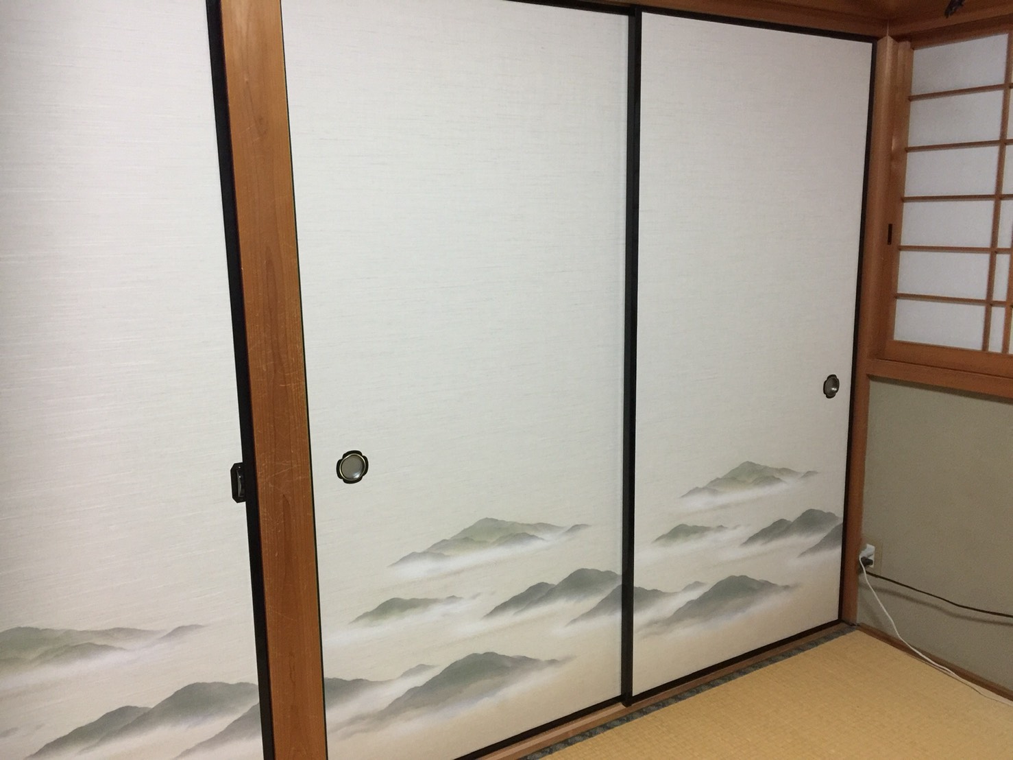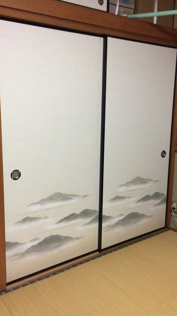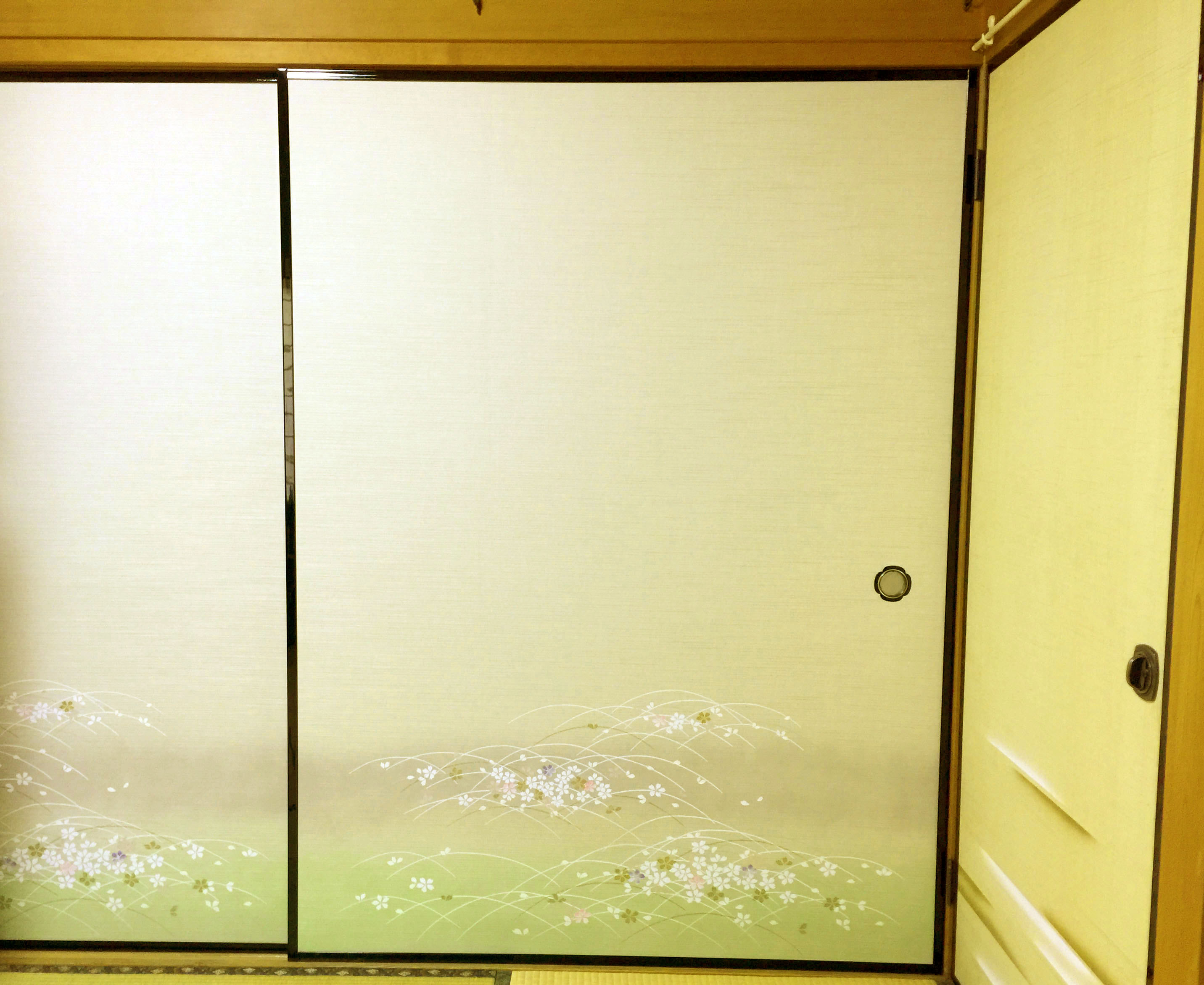 地域船橋市 施工内容襖張替え 巾広2枚 押入4枚 片開1枚 戸襖1枚 天袋2枚 日数4日 コメント久しぶりの3間用巾広襖です。3間用の襖紙は種類が少なかったのですがお好みの絵柄を選ぶことが出来ました。 とても綺麗に仕上がりました。